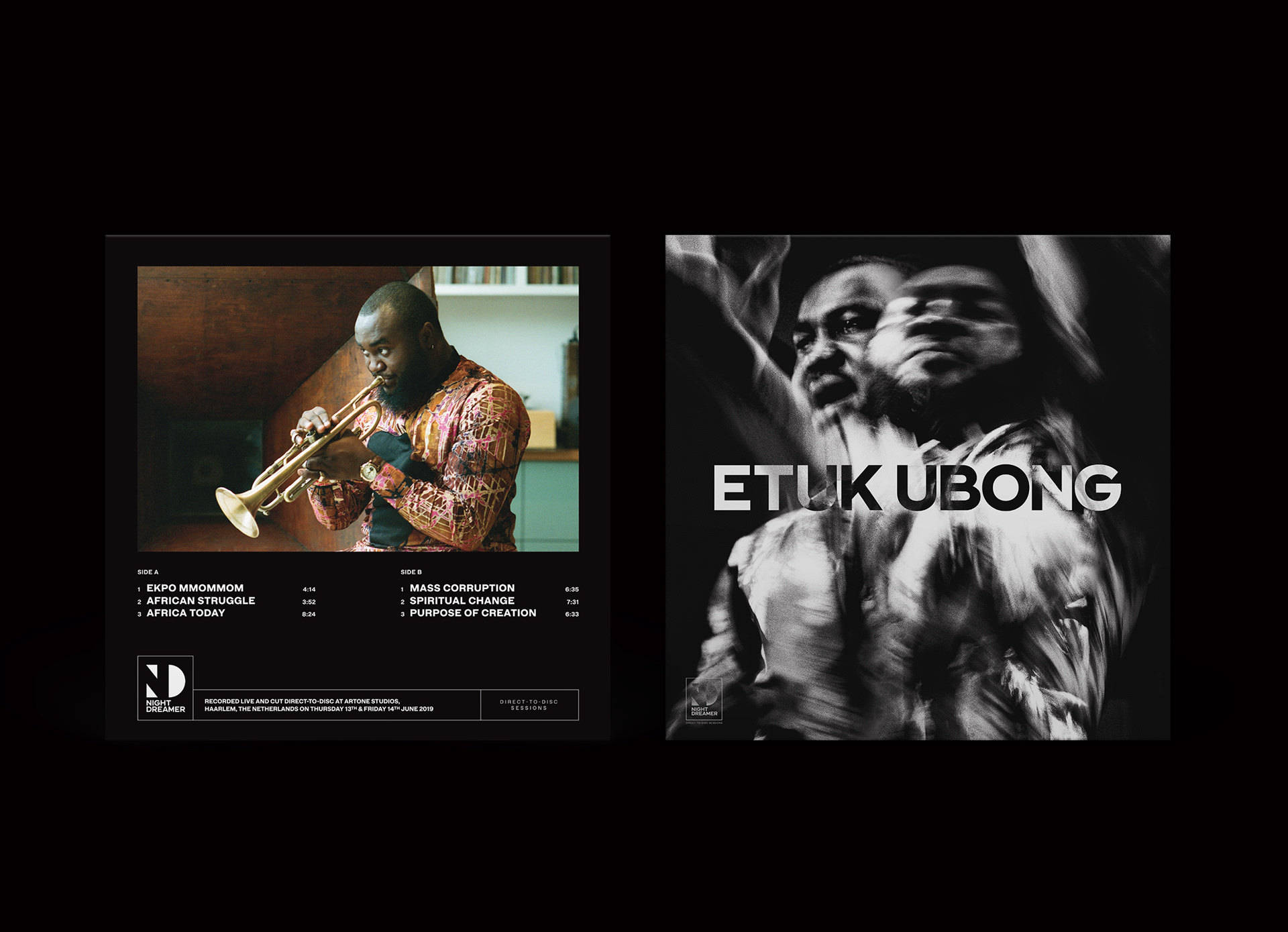 Ubong was invited by Night Dreamer to record at Haarlem’s Artone Studio, home to an enviable collection of vintage mastering and recording equipment and situated right above a pressing plant. He assembled an international ensemble of the highest calibre to record his compositions direct-to-disc, avoiding the interference created by widely adopted recording techniques and capturing his enigmatic live performance in its most natural and explosive form. Ubong is joined by another Lagos-based musician, Michael Awosogo, also on trumpet, and a hand-picked group of UK and Netherlands-based musicians who finally after an impromptu show the night before, recorded the whole album in just one sitting on the last day of the five-day session.