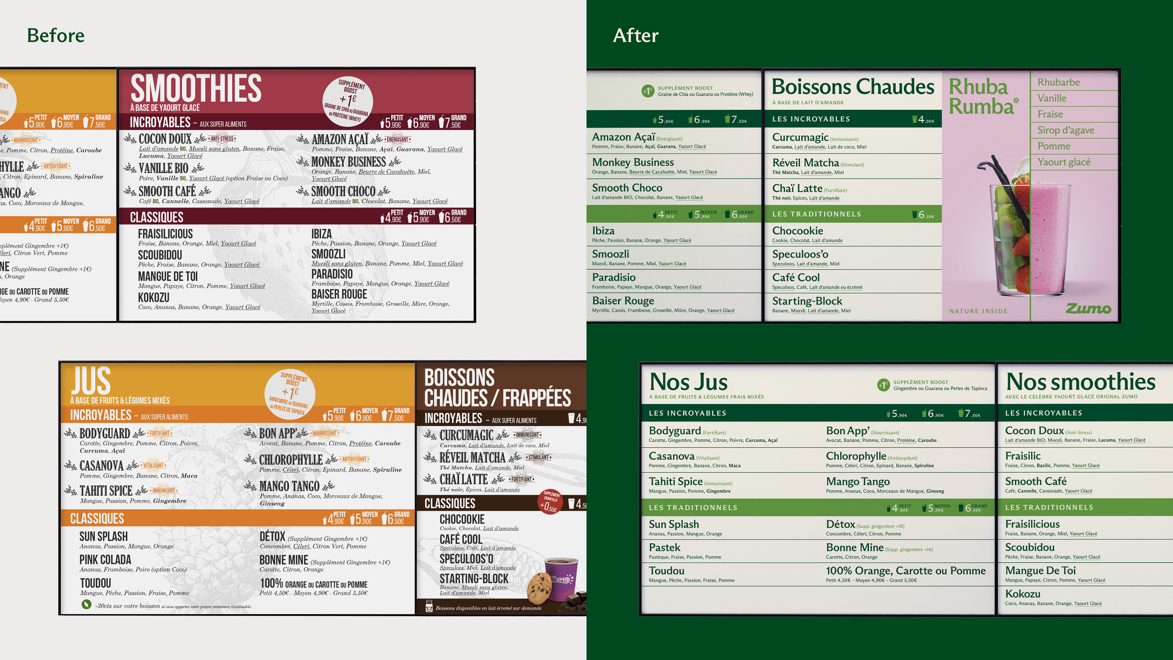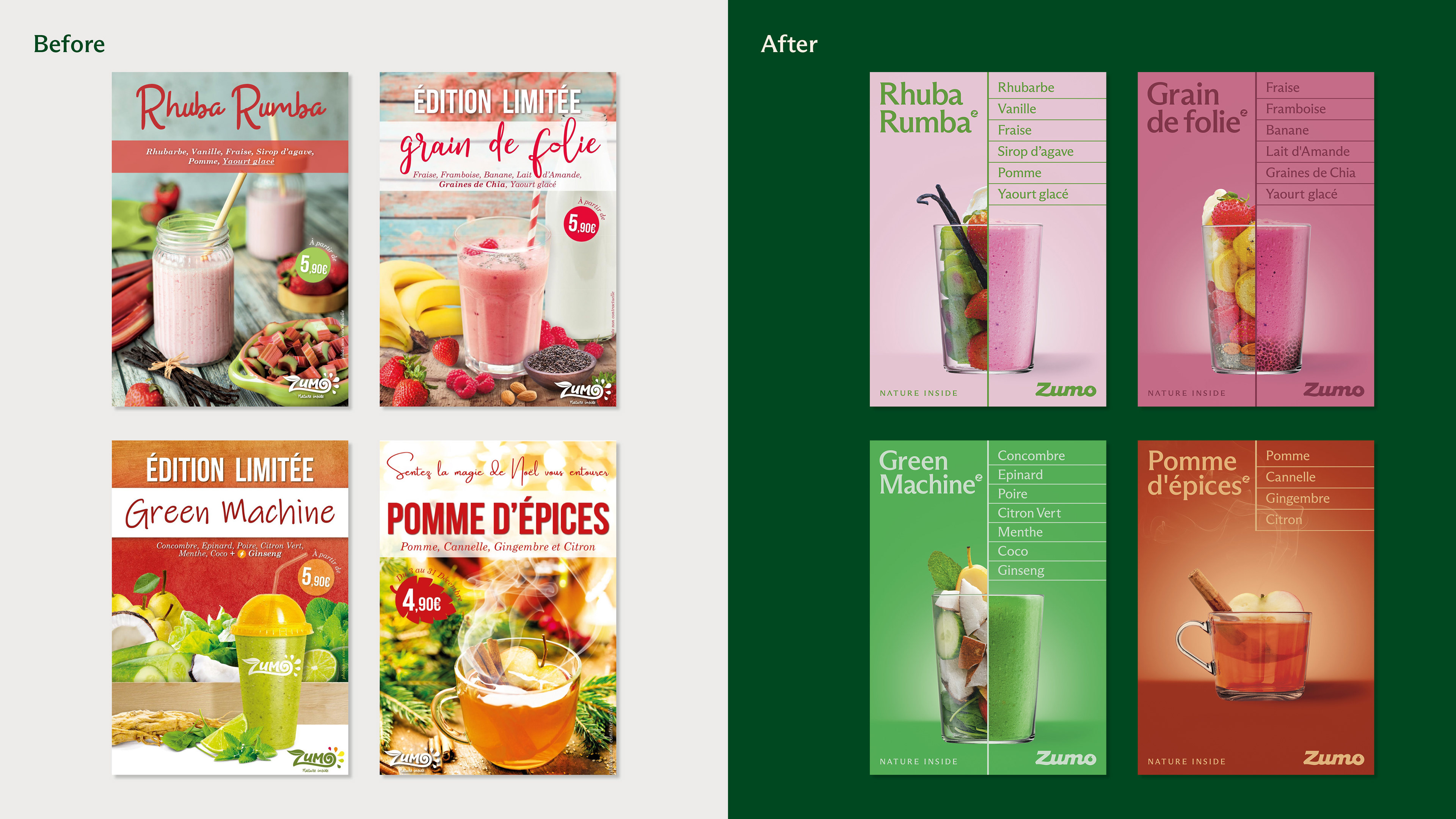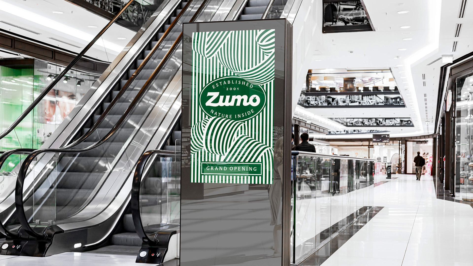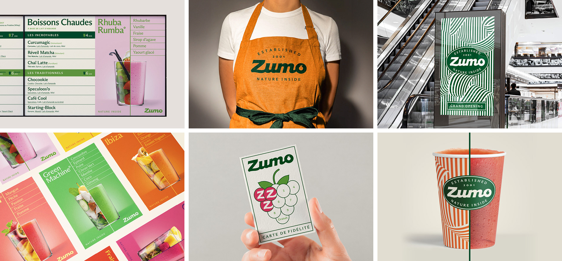 ZUMO, a French juice franchise, initially approached me to redesign their logo and marketing materials. This ultimately led to a complete rebranding. The new concept involved the execution of their juice product photography and I designed uniforms menus colour palettes store branding applications and wayfinding and billboard designs. As the company wants to appeal to a modern health and luxury-conscious consumers. When the franchise opened a new location in a prestigious Parisian shopping centre, they wanted to capitalise on this opportunity to apply the new graphics across all their locations and franchise venues. We gave the logo a more classical feel with serif detailing while retaining the hidden fruit element. This, combined with the striped green or orange fruit market stall pattern, allowed us to apply the design to packaging in an iconic way. This removed the harmful throwaway plastic cups juices are usually served in and applied the pattern to shop fronts cost-effectively. For more information about the project or assistance with a similar project, please don’t hesitate to contact me.